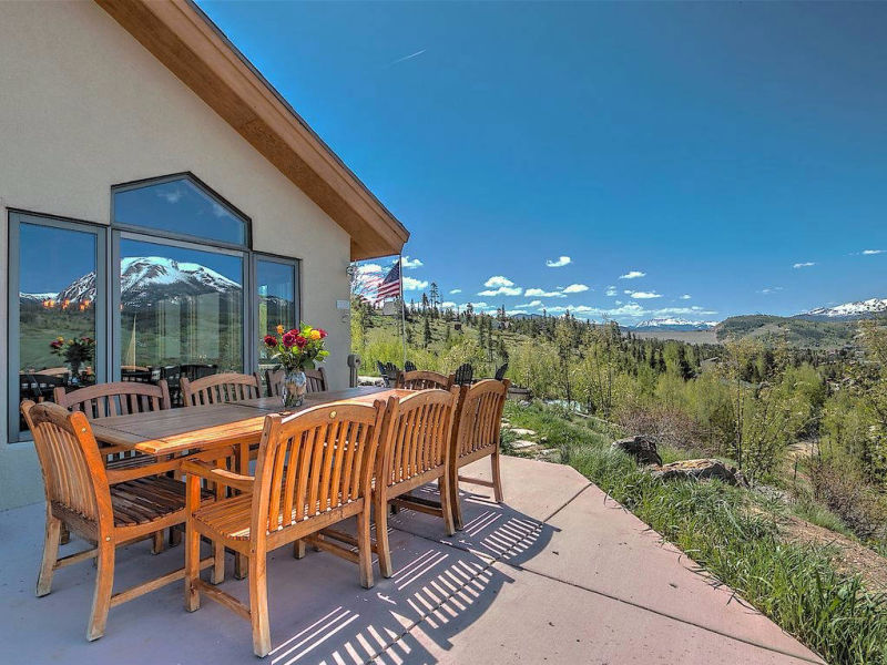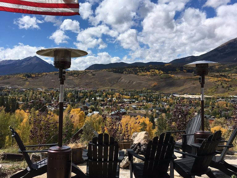 The outdoor gas fire pit overlooks Breckenridge and the main patio showcases panoramic views of the Gore Range.