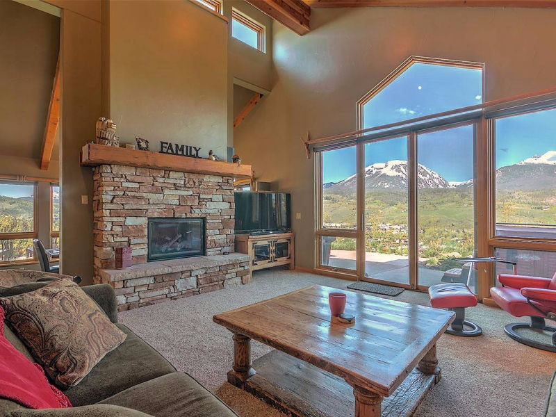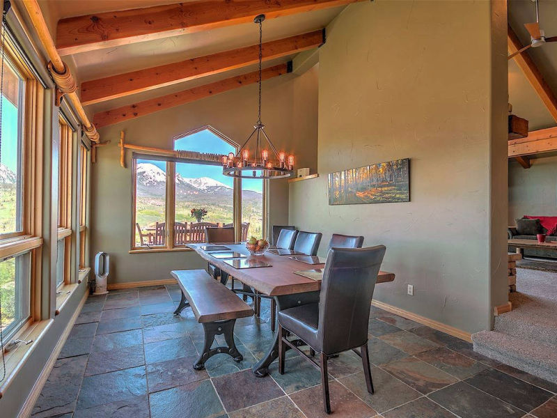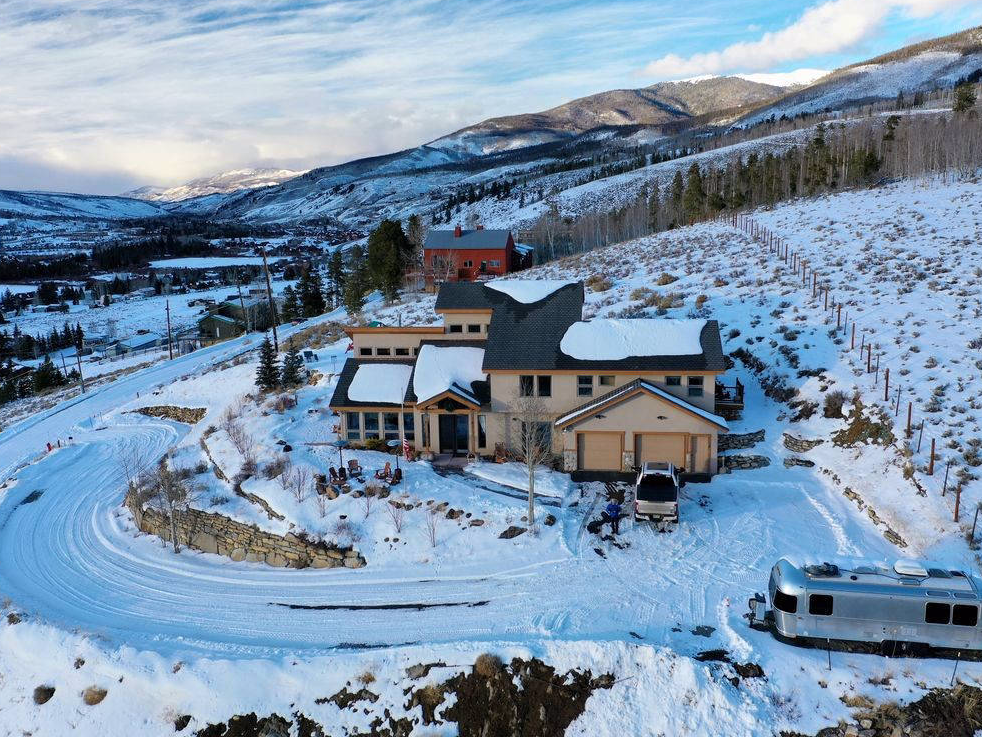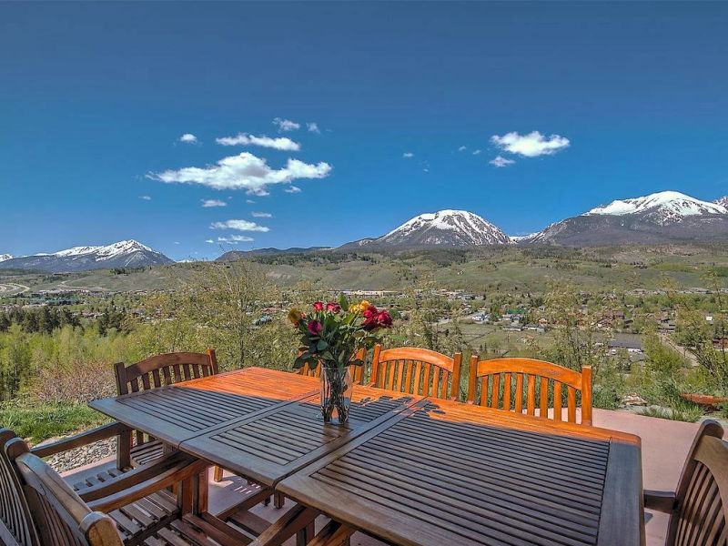 This single-family retreat sits on top of the hill, isolated on a full acre above Silverthorne with shopping within walking distance. It feels remote and secluded on its own hilltop, with unobstructed views of the mountain range.