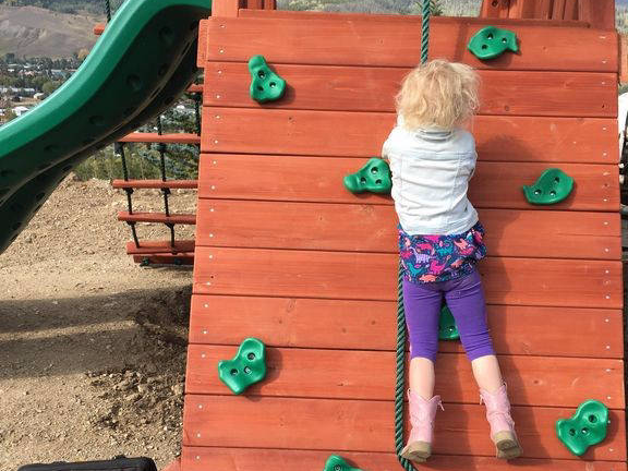 A Pack and Play with mattress for a baby, booster seat and stool for toddles to reach the sink. New childrens' playground on premises.