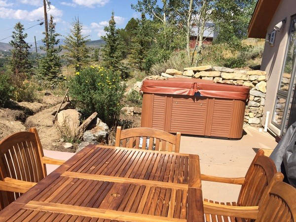 Outdoor Jacuzzi for 7 with privacy and mountain views! A top of the line new Weber Genesis II with rotisserie outside grill (and teak picnic table and chairs) allows for additional cooking and entertainment options.